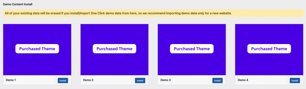Note: Before proceeding, keep in mind that importing the demo will overwrite all existing settings and content with demo data. It is highly recommended to perform this action on a fresh site.