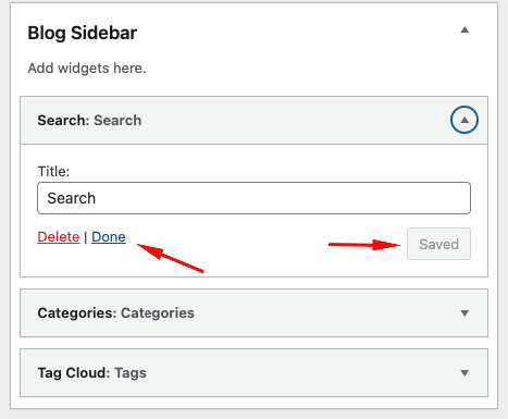 • Drag a widget from the Available Widgets section to a Sidebar or Widget Area on the right.